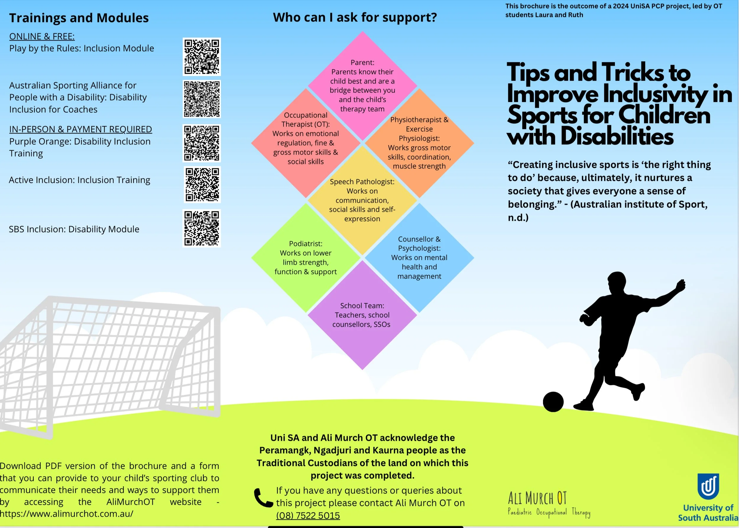 A UniSA PCP project completed at Ali Murch OT in 2024 resulted in the development of the Get to know my child resource. The aim of this resource is to provide sporting coaches with information about children with extra needs, to support inclusive participation in local sports. This form can be printed and completed independently or with the assistance of your OT.